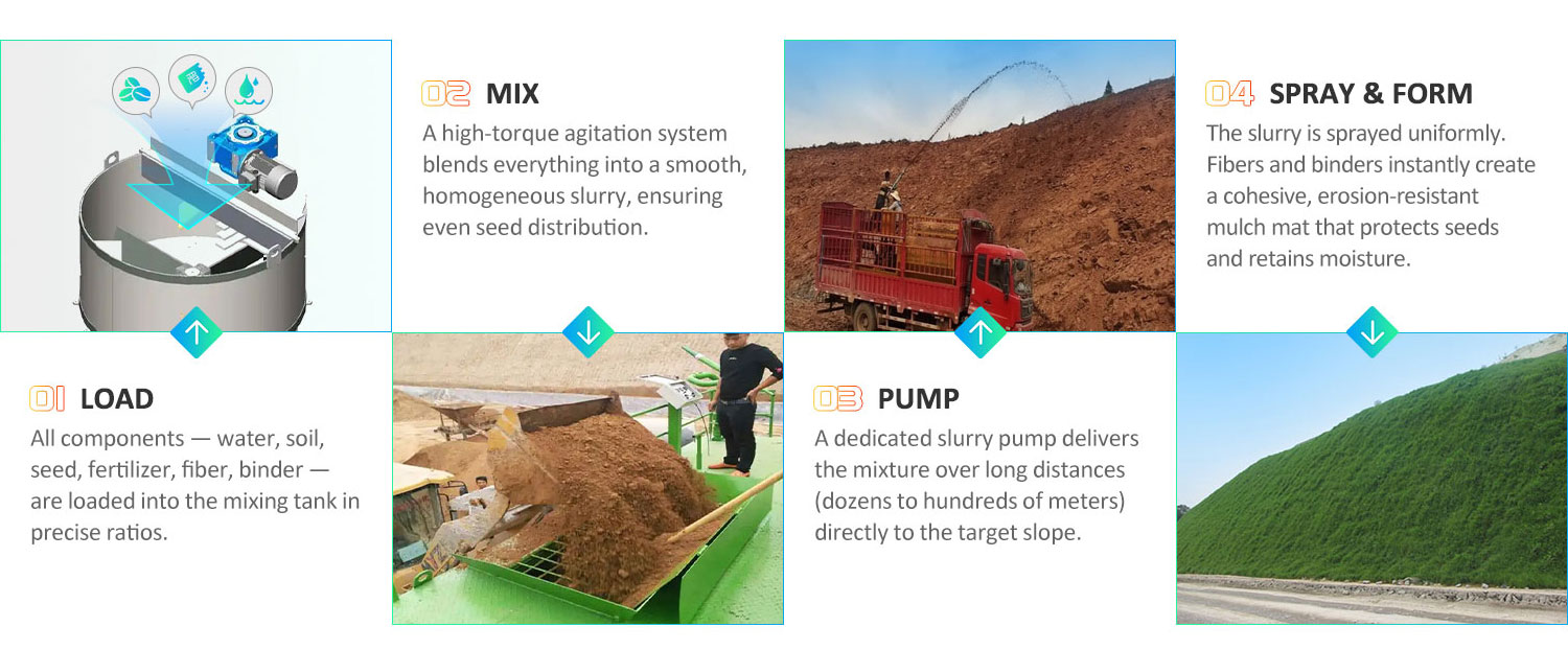 | Soil-Reinforced Hydroseede | YG-132 | 6-8 m³ | 200-800 m² | Horizontal: 30-55 m | 132 kW | 4,300 kg |